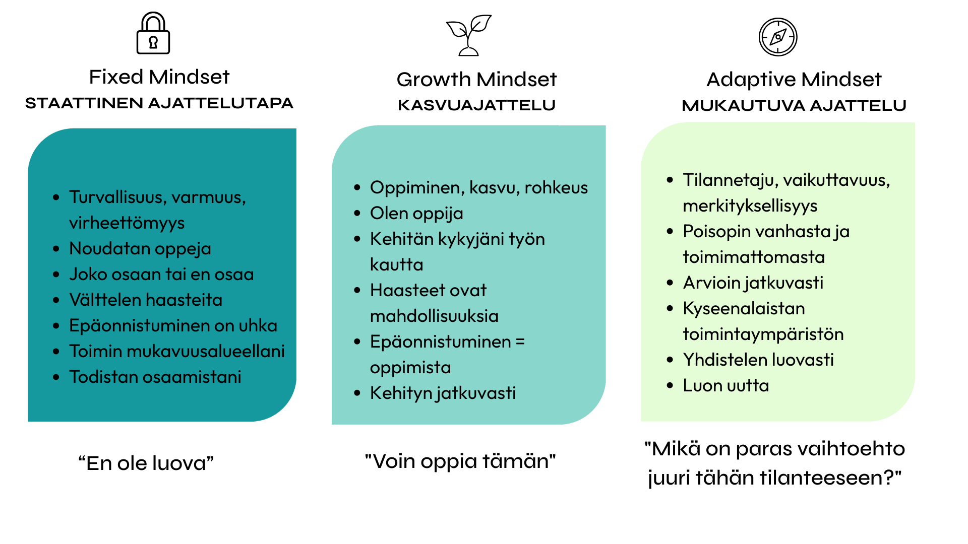 • Growth mindset (kasvuajattelu): Todellinen kasvu alkaa, kun ymmärrämme, että osaaminen ei ole staattista, vaan sitä voi kehittää työllä ja sinnikkyydellä. Emme enää välttele haasteita, vaan näemme ne mahdollisuuksina oppia. Epäonnistumiset ovat arvokkaita oppimisen paikkoja.